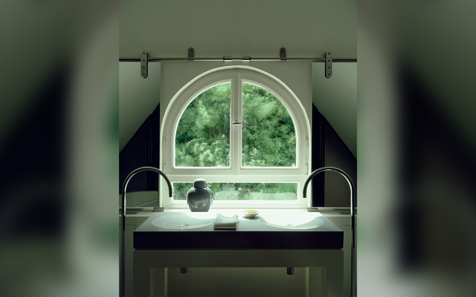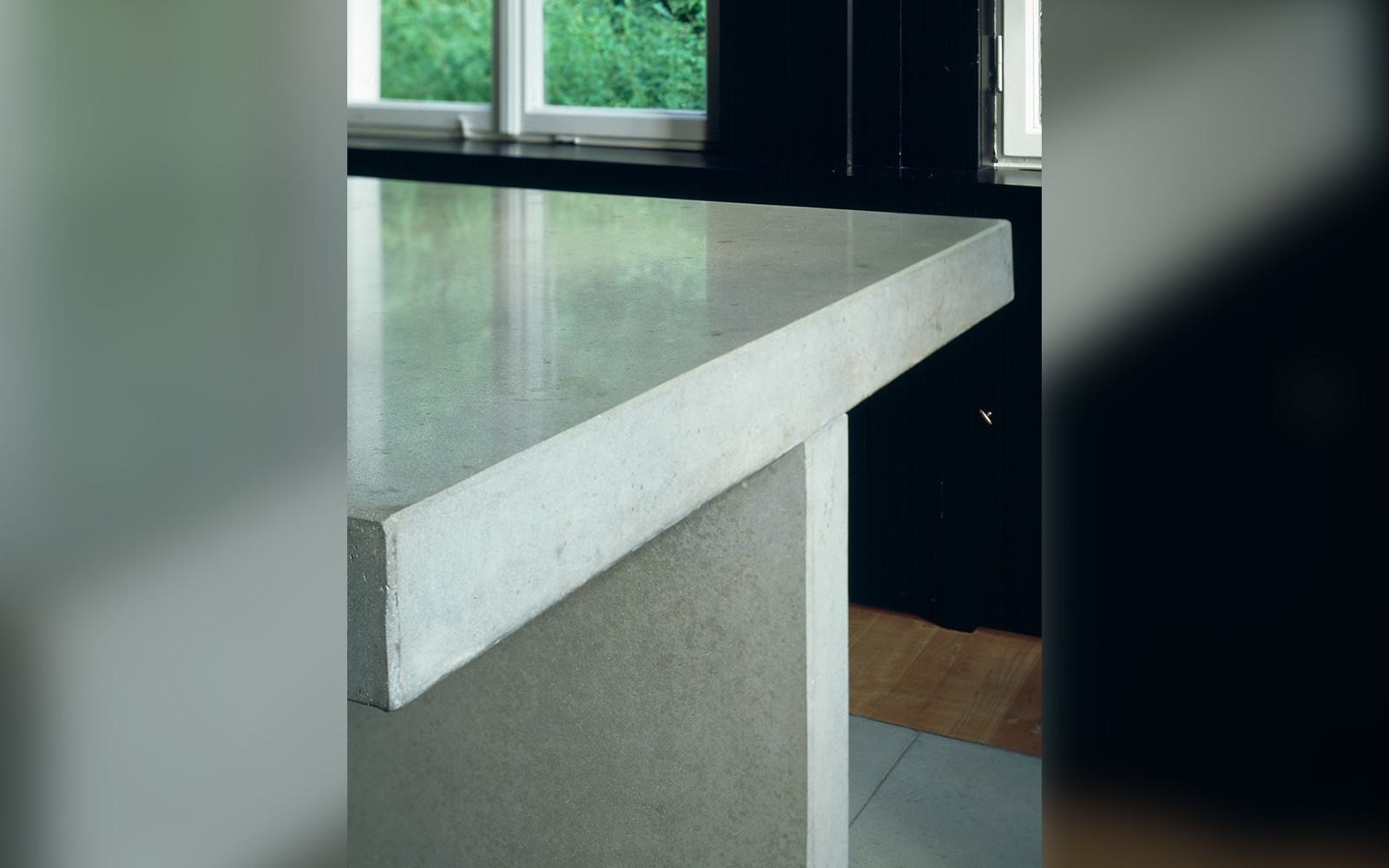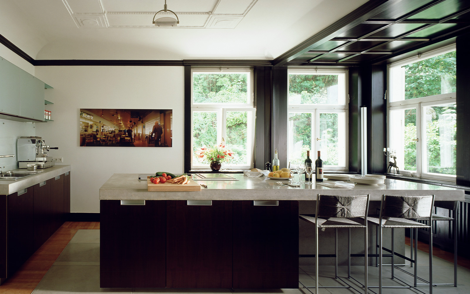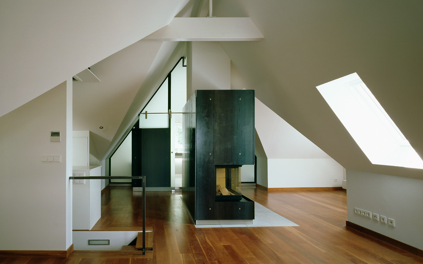 Das Gebäude spielt mit dem Kontrast zwischen alt und neu, zum Beispiel alte Holzvertäfelungen stehen in Konfrontation zu präzisem technoiden Sichtbeton.